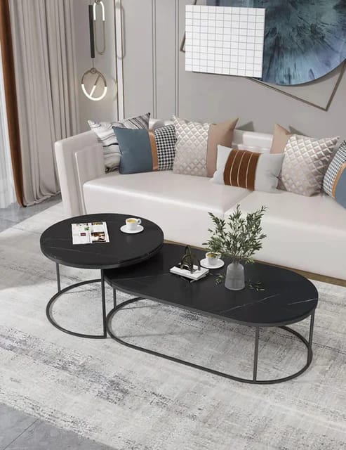 طقم متداخل بيضاوي مع سطح خشب رخام اسود لون اسود الخامة الاساسية حديد خامة السطح ام دى اف طلاء لامع المقاسات : القطعه الدائرية عرض50 ارتفاع 45 عمق 50 القطعه البيضاوية عرض 80 ارتفاع 40 عمق 40
