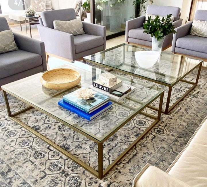 طقم ترابيزات مع سطح زجاج لون ذهبي خامة اساسية حديد و خامة السطح زجاج المقاسات : القطعتين متشابهين فى المقاس عرض 90 ارتفاع 40 عمق 70 طلاء مطفى |